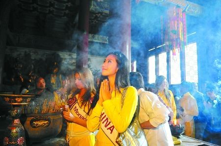 在山門口,一對(duì)20多歲的小夫妻也跟著大批游客一起看來自世界各地的美女。也許是看到男孩眼神一直停留在美女身上,女孩就一把挽過男孩的手臂,很溫柔地問:“老公,我美還是旅游小姐美啊?”男孩很機(jī)靈,馬上轉(zhuǎn)過頭看著女孩說:“在我心里你永遠(yuǎn)都是最美的,在我眼里,旅游小姐是最美的。”周圍的游客哄堂大笑,女孩打了男孩一拳,臉紅紅地笑了。