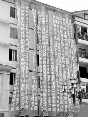 昨天,在不少門戶網站的論壇上出現了一篇名為《洗腳城開張的驚人場面 為何這么多公檢法機關捧場》的帖子。帖子一開始就提出了一個質疑:一個洗腳城開張為何有這么多公檢法機關捧場?網友拍攝的圖片顯示:在張家界武陵源區,一棟建筑物外懸掛著二十多個紅底白字的條幅,分別為“××熱烈祝賀金體康濯足休閑會所開業大吉”、“××熱烈祝賀金體康濯足休閑會所生意興隆”。最讓人驚訝的是,這些祝賀單位,不少竟然是當地的政府機關,包括人民法院、人民檢察院、稅務局、房管局等,涉及到的政府部門多達10余個。