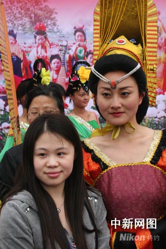 中新網(wǎng)4月19日電 (李洋)4月正是牡丹盛開的時(shí)節(jié)。“網(wǎng)上看河南”采風(fēng)團(tuán)18日先后探訪了洛陽(yáng)國(guó)際牡丹園和國(guó)家牡丹園,遍賞中國(guó)和世界的名貴牡丹品種。當(dāng)?shù)剡組織演藝團(tuán)體盛裝重現(xiàn)唐朝武則天時(shí)期的風(fēng)貌,不少女記者對(duì)武則天這一歷史人物情有獨(dú)鐘,還紛紛與“武則天”合影留念。