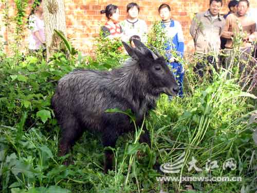 無獨(dú)有偶,昨日下午3時(shí),距都昌縣中館鎮(zhèn)幾公里的鄱陽縣銀寶湖鄉(xiāng)銀寶村農(nóng)民馮奇,在自家門前的菜園內(nèi)發(fā)現(xiàn)一只“野山羊”在偷吃菜葉。只見這家伙身高1.2米左右,體重約100公斤。看到有人圍觀,“野山羊”飛快逃竄,村民們四處堵截,3個(gè)小時(shí)后才將它在一條胡同內(nèi)制服。鄱陽縣林業(yè)局的野保專家趕到現(xiàn)場(chǎng)告訴村民,這只“四不像”學(xué)名叫蘇門羚。