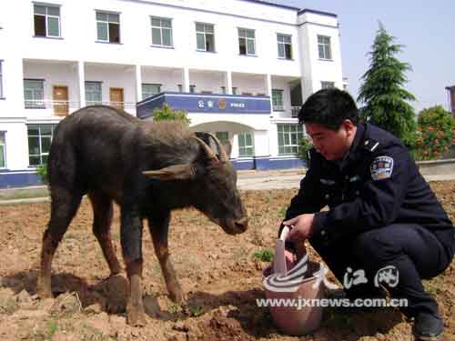 昨日清晨5時(shí)許,都昌縣中館鎮(zhèn)雙橋村一村民剛打開家門,發(fā)現(xiàn)門前有一只黑色“怪物”經(jīng)過。這只“怪物”身體和蹄子像水牛,頭部則像羊,但棱角很短小。