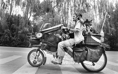 頭上戴著酷酷的骷髏頭巾,蓄著暗紅色的三角尖小胡子,脖子和手腕上掛著古怪的項鏈和手環(huán)……昨日中午,一個騎著“哈雷式”自行車,長相酷似海盜的老外在東城拐下街引起了不少好奇者的圍觀。這個名叫Alexandro(如右下圖)的巴西人從2003年就開始騎著自己改裝的自行車出發(fā),橫跨了歐亞大陸的多個國家,接下來的時間里他還將騎著車和他唯一的伙伴——小黑狗“杰”完成環(huán)游世界的夢想。