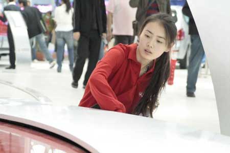 4月23日, 一位在北京車展現場做清潔工的紅衣MM被人偷拍,拖地、擦洗展臺、拋光輪胎,紅衣MM十幾張工作照被發布在了網上。拍攝者說他是在拍攝車模時,無意間發現了正在旁邊為車輪做拋光的紅衣MM的,他貼出的第一張照片是紅衣MM在照片的最左邊,遠遠地站在兩個車模的背后,只能模糊地看到半張臉。