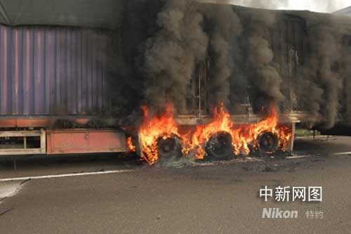當天早晨6時許,一輛車牌為冀AF3978(掛車牌照為冀AZ747)的大貨車在京珠高速臨長路段由北往南50公里處行駛時,車輛右后胎因為摩擦突然起火。隨后,車上裝載的雞蛋的紙盒也很快燃燒起來,駕駛人馬上報警。