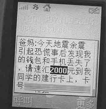 遭遇類似騙局的不僅僅是蘇先生。在天涯論壇上,一位網(wǎng)友“風正帆懸”發(fā)帖子警示大伙。5月13日上午,他突然收到一條短信:“爸媽,今天地震余震引起恐慌,事后發(fā)現(xiàn)我錢包和手機丟失了,請速匯2000元到我同學的建行卡上,卡號436742338170101245,胡程”。