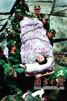 北川中學(xué),盡管教學(xué)樓已垮塌近兩天并經(jīng)受了多次余震,記者昨日還是不斷聽(tīng)到廢墟中有學(xué)生呼救的聲音,說(shuō)明被掩埋人員仍有生還希望。據(jù)估計(jì),這所中學(xué)死亡和失蹤的人數(shù)在1000人以上。