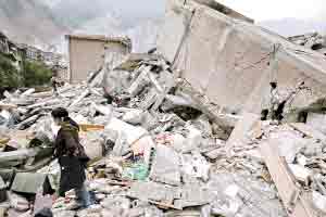 記者從李金泰家往回走的路上,經過一排傾斜的房屋前時,走在記者前面的一名醫務兵突然呼喝了一聲:“快走!”醫務兵拼命地往空曠地段奔去,一個本能的反應——余震!記者奪命地跟著醫務兵跑離傾斜房屋的樓下。果然,又是一陣從地底傳來的輕微搖晃。“你們兩個要小心啊,這些樓房已經沒有支撐點的了,再來多幾次余震的話,說倒就倒的!贬t務兵告誡記者。盡管暫時安全了,但剛才一幕讓記者真切地感受到大地震發生的那一瞬間的恐怖。