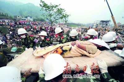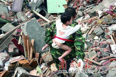 “我一定要找到家里人,死也要死到一起!痹诰d陽市開出租車司機胡女士說。出事后,她開車前往北川找她的愛人。當天下午5點多,她趕到時小縣城已面目全非。胡女士徒步來到愛人上班的新城區(qū),在廢墟上大聲叫著丈夫的名字。終于,丈夫有了回應(yīng):“我在這里,背上有塊大石頭!”胡女士蹲下來說:“不要怕,很快有人來救我們了。”為了讓愛人不因為恐慌和失血過多昏睡過去,胡女士跪在地上和愛人談起往事,不斷鼓勵、安慰他。半小時后,巡邏人員發(fā)現(xiàn)他們,胡的愛人獲救。而胡女士本人,則因為長時間跪在一塊碎玻璃上,被割掉一大塊肉。(作者:記者胡亞柱張蜀梅)