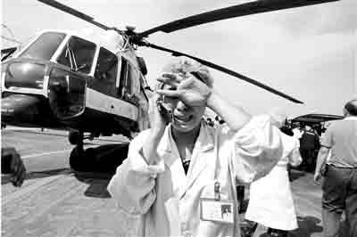 昨天下午4點05分,東方通用航空公司的一架米1-71直升機緩緩降落在廣漢機場停機坪上。艙門打開,40歲的女護士杜娟下了飛機,招呼著成都120急救中心的醫(yī)護人員將傷員抬到急救車上。杜娟是北川縣禹里羌族鄉(xiāng)衛(wèi)生院的護士。5·12地震后,禹里與世隔絕,直到昨天才等到直升機將重傷者送出。杜娟隨機照顧患者。傷員都下了飛機后,杜娟向于波借手機,電話打通時,她手開始顫抖,撕心裂肺的哭聲終于無法忍住。那是她六天后,第一次給外面的親人打電話。巨大的螺旋槳轉(zhuǎn)動聲中,人們只能依稀聽到她的哭訴:“我要去找他,不能連個尸體都沒有。”于波默默地看著她,不到一個小時前,他還覺得這個女護士嚴(yán)厲得有點過分。