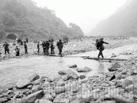 “我們在這里等候團長和戰(zhàn)友們回來,他率領(lǐng)部隊正引領(lǐng)數(shù)百災(zāi)民從高山密林中向漢旺轉(zhuǎn)移。”前日19時,有著“烏蒙鐵軍”之稱的解放軍某部團政委曾祥明站在亂石嶙峋的綿陽河上游河谷中,十分焦急地告訴記者,他們已與團長周宏許所率領(lǐng)的數(shù)百官兵失去聯(lián)系10多個小時了。