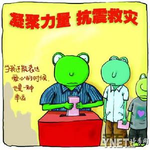 在天涯社區(qū)張貼的漫畫里,小鴨子表情嚴(yán)肅地對(duì)小雞說(shuō):“賑災(zāi)重建,長(zhǎng)期任務(wù)”;三只小老鼠不停用鐵鍬挖坑蓋房,還拿著大喇叭高喊:“眾志成城,共抗震災(zāi)”;“蘑菇家族”的醫(yī)生則身背降落傘空降災(zāi)區(qū)……