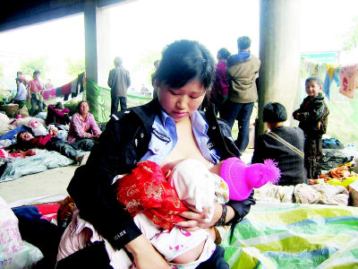 “幺兒,別急,慢慢吃,吃飽了要乖哦!”蔣曉娟以女性特有的溫柔、體貼,安撫著這些尚在襁褓中的嬰兒。當看到吃飽了的嬰兒在她溫暖的懷抱里沉沉入睡后,蔣曉娟笑了,笑得那么甜,笑得那么美,全然忘記自己正身處震區災民救助點。而嬰兒們的親屬們卻都哭了,在看著自己家的小孩在地震三天后,終于吃上了一口母乳時,在得知蔣曉娟自己也有一個半歲的兒子卻無暇顧及時,他們無不感動得流下熱淚。