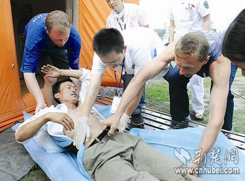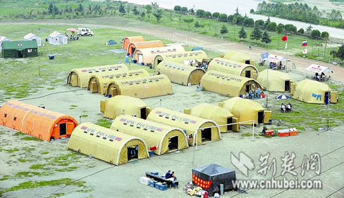 5月24日,汶川大地震后第12天,陽光投射在彭州市職業(yè)中學(xué)操場上的20座巨型充氣帳篷上,不時(shí)有高鼻深目的“老外”進(jìn)進(jìn)出出。