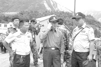坐下來的時候,已經有幾個漢子圍坐著在狼吞虎咽地吃飯。這幾個漢子,一個個皮膚黝黑,額頭大塊脫皮,眼泡腫脹。一個尤為烏黑消瘦的漢子用嘶啞的聲音招呼我們多吃點。聽旁邊的人介紹,才知道這個漢子是四川省公安廳政治部主任、阿壩州抗震救災指揮部副總指揮簡勝彬。記者簡直不敢相信自己的眼睛。因為工作關系,我們對他再熟悉不過了。但是,坐在對面幾分鐘了,竟然沒能認出他來。連續在救災現場奔忙了9天多,沉痛的心情、繁重的抗震救災工作任務、惡劣的自然環境、簡陋的生活條件已經讓他完全變了樣。