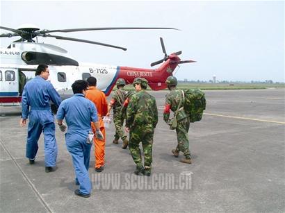 得到前線救援人員通過海事衛(wèi)星報(bào)告的消息后,德陽(yáng)抗震救災(zāi)指揮部心急如焚,人的生命高于一切!由于楊家溝濃霧彌漫,27日下午,救援直升機(jī)冒著危險(xiǎn),在距地面10米的空中展開搜索。“看,下面有人影!”飛機(jī)盤旋了很久,但因當(dāng)?shù)赜幸慌琶芗母邏壕,飛機(jī)無法降落,眼看大霧越來越濃,救援直升機(jī)只得返回廣漢機(jī)場(chǎng)待命。