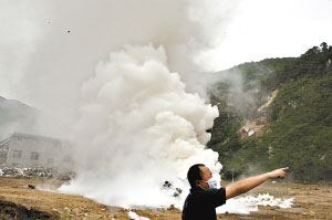 昨天下午3時(shí)35分,北川擂鼓鎮(zhèn)突然升起漫天的煙霧,鎮(zhèn)中心全部籠罩在濃煙之下,部分地方能見度為零(見上圖)。現(xiàn)場(chǎng)的中國(guó)疾控中心工作人員說,煙霧是因消毒干粉、漂白粉等消毒劑自燃產(chǎn)生的。這已經(jīng)是擂鼓鎮(zhèn)三天內(nèi)連續(xù)第三次發(fā)生消毒劑自燃事件。自燃產(chǎn)生的氯氣,共導(dǎo)致近百人出現(xiàn)呼吸困難、嘔吐等癥狀,他們已被送至野戰(zhàn)醫(yī)院救治。