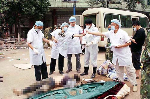 解放軍戰(zhàn)士不懈地挖掘,用雙手搬開大大小小的磚頭和石塊似的水泥碎塊,兩臺(tái)大型機(jī)械不停地工作,不時(shí)有遇難者尸體從廢墟中被發(fā)現(xiàn)。戰(zhàn)士們把這些尸體抬到路邊,有人專門噴灑消毒粉劑,然后我們便為死者清洗面部,以便家屬辨認(rèn),視聽技術(shù)人員拍照。無家屬辨認(rèn)的尸體,我們就從尸體肋部取下一塊軟骨放進(jìn)預(yù)先備好的固定液瓶里編號(hào)保存。挖出的尸體大多數(shù)都已變形,有的肢體殘缺,腐爛嚴(yán)重,操作者不得不戴上防毒口罩。