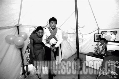 隨著生活逐步穩定,大家漸漸習慣了帳篷生活。王小波和父親王新民又商量起結婚的事情!鞍凑瘴覀兊娘L俗習慣,定下婚期后,是不能延誤的!蓖跣旅裾f,當時自己在想,在黨和政府的幫助下,大家的生活逐漸安定下來,所以即便環境簡單、條件艱苦,但還是要為兒子舉辦一個簡單的結婚儀式,“只要能夠把女方順利接過來,就是一個好事!睂δ蟹郊依锏臎Q定,郭富娟感到很驚喜,很快就滿口答應了。