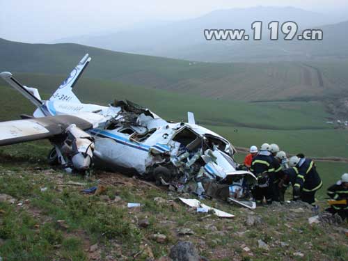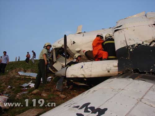 由于失事地點(diǎn)位于山區(qū),消防救援車輛行進(jìn)至距現(xiàn)場(chǎng)10公里處已無(wú)法繼續(xù)前進(jìn)。消防官兵迅速攜帶救援裝備徒步行走,山高坡陡,道路極其難行,消防官兵于18時(shí)30分左右趕到飛機(jī)失事地點(diǎn)。救援人員發(fā)現(xiàn)失事飛機(jī)破損嚴(yán)重,右側(cè)發(fā)動(dòng)機(jī)仍在正常運(yùn)轉(zhuǎn),未發(fā)生火災(zāi)。機(jī)艙外遇難者尸體兩具,機(jī)艙內(nèi)遇難者尸體一具、受傷被困者一名。消防官兵迅速利用剪斷器、擴(kuò)張器等工具將機(jī)體破拆,于18時(shí)50分將被困人員成功救出,隨后又將另一名機(jī)艙內(nèi)遇難者救出。并將獲救人員送上120急救車,但是飛機(jī)的右側(cè)發(fā)動(dòng)機(jī)仍在高速運(yùn)轉(zhuǎn),外殼已變色。消防官兵僅用兩分鐘時(shí)間關(guān)閉了外殼已發(fā)紅的發(fā)動(dòng)機(jī),但此時(shí)機(jī)翼竄出火苗,消防官兵利用滅火器和沙土迅速將火災(zāi)撲滅。