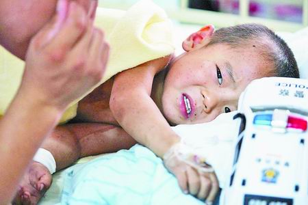 昨日上午10時20分,在鄭州市兒童醫院住院部外一科病房,記者見到了這個正在側身熟睡的男孩邢錦祥。此時,小錦祥正在輸液,他的右臂、后背等部位有傷,包著紗布。