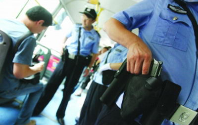 南京公交安保措施又升了一級(jí)。自從昆明公交發(fā)生爆炸案后,南京警方在原有的基礎(chǔ)上再次加強(qiáng)了公交車的安保措施,幾天前,警方?jīng)Q定對(duì)乘坐公交車的乘客進(jìn)行開(kāi)包抽檢,從昨天起,民警們又佩帶槍支上車,保護(hù)乘客安全。
