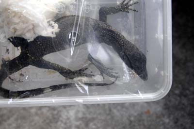 7月31日上午7時(shí)許,石井邊防派出所民警在泉州市南安石井碼頭對來靠臺灣貨輪進(jìn)行例行檢查時(shí),在船上的洗浴間內(nèi)發(fā)現(xiàn)了兩個(gè)可疑的紙箱,紙箱內(nèi)有幾十個(gè)大小不一的塑料盒子,盒子內(nèi)裝有色彩繽紛、形態(tài)各異的蜥蜴、青蛙、烏龜?shù)扰佬袆?dòng)物,約有200余只。隨后,邊防民警又在碼頭上抓獲了前來取貨的周某。