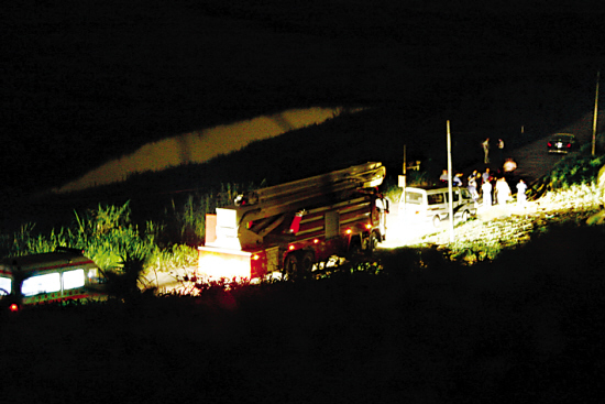 記者接報趕赴時,發(fā)現(xiàn)警方在距現(xiàn)場一公里處便已開始設(shè)卡封鎖,禁止無關(guān)人員進(jìn)入(見上圖,陳文筆、張雄高攝)。209倉庫內(nèi)警燈閃爍,大批消防車出動。由于是化學(xué)品失火,不能用水撲救,因此不斷有泥頭車從外面運(yùn)來干沙滅火。昨晚11時許還增加了一輛挖掘機(jī)進(jìn)場。待情況穩(wěn)定后,不斷有此前從倉庫疏散出來的工人經(jīng)同意后重新進(jìn)入庫區(qū)。