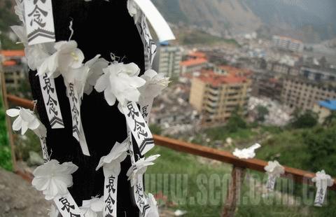 在一個被當地人稱為“三倒拐”的地方,鐵血四十師在此拉起了一方橫幅:沉痛悼念北川遇難同胞。橫幅下面擺放著一個大的花圈,花圈兩邊分別是假花拼成的“5·12”和“北川”字樣。橫幅下的欄桿上,密密麻麻貼著寫有“哀悼”二字的小紙條,每一個紙條,代表著一個亡靈。