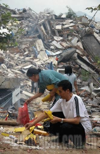 廖女士沿著兒子的上學路線走著,但哪兒還有路啊?都是一片廢墟。一塊“北川羌族自治縣惠農服務中心”的牌子立在一塊空地上,它的后面,是一堆建筑垃圾。“前面是醫院,醫院旁邊是幼兒園。”穿過曲山街,廖女士爬上了廢墟,艱難地走著,然后,在一個小平臺處停了下來,擺放好大花束,將紙錢點燃。“媽媽來看你了……你要記得回來看媽媽,我等你,聽到沒有,嗯?”雨水和淚水打濕了她的臉。