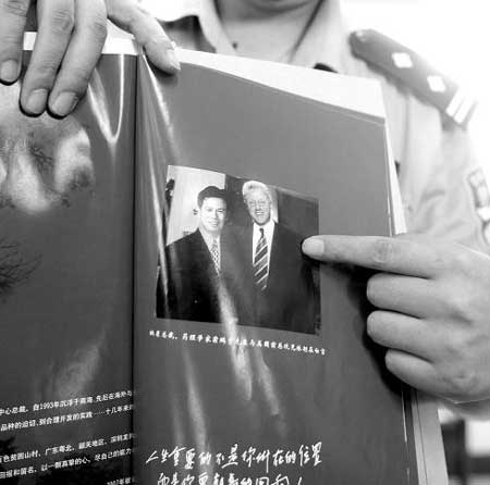 翁鵬宇合成了他與克林頓的照片,印在宣傳品上。杜俊嶺 攝