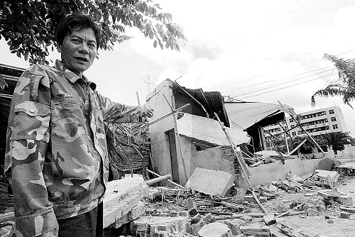 “為了讓我們乖乖交出‘保護費’,這伙人不僅打了工人,還在光天化日之下開著推土機推倒了我們的房子。”前天上午,在東方市八所鎮十字路東100米處一家摩托車修理店門前,小嶺村村民張用良氣憤地說。
