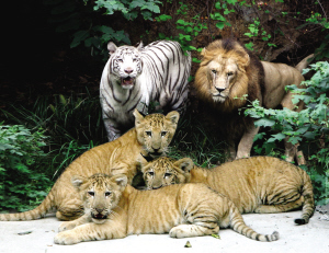 據(jù)了解,獅虎獸的父母是一只雄性非洲獅和雌性孟加拉白虎“小雪”,都是2002年在紅山動(dòng)物園出生的,一起生活在“獅虎生態(tài)園”,感情很好。當(dāng)初跟它們一起關(guān)進(jìn)園里的還有另外五只猛獸,包括兩只母獅,一公一母兩只虎,以及一只母白虎?墒沁@只雄性非洲獅就是喜歡跟“小雪”待在一起,對(duì)自己的同類——兩只母非洲獅反倒不理不睬。后來,工作人員先后移出了兩獅兩虎,園里只留下“小雪”、雄性非洲獅,和一只母東北虎。園子里“太平”了,“小雪”跟它的獅“哥”更是形影不離,親密不已,那只母東北虎成了“電燈泡”。
