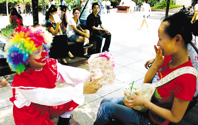 “小姐,你好,請接受我的禮物……”昨日中午,在沙區三峽廣場,一名穿著紅色小丑服,手拿一盒包裝好的禮物,單膝下跪在一名漂亮女子面前。為了逗女孩開心,他還唱起《兩只老虎》,惹得路人哈哈大笑。然而,那名女子的神情卻非常驚訝……原來,小丑是一家道歉公司的員工,正按客人要求給人道歉。記者了解到,湖南男子彭敏于上月成立的“重慶快樂家族公司”,是本市首家專門幫人道歉的公司。