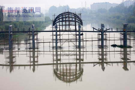 10月1日,江蘇省淮安市境內“中國南北地理分界線標志”工程進展順利,建筑工人正在安裝南北地理分界線標志球。