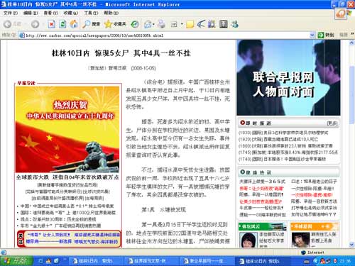 10月6日,本報桂林新聞熱線接到一名讀者反映,稱新加坡《聯合早報網》上面有一條消息稱,“桂林全州縣10日內驚現五女尸,其中四具一絲不掛!眴柋緢笥浾呤欠裰肋@個新聞。隨后,記者在網上輸入“全州縣紹水鎮”搜索,在新加坡《聯合早報網》發現了這條題為《桂林十日內驚現五女尸 其中四具一絲不掛》,網上注明出處是新加坡的《新明日報》,刊登時間為10月5日。消息的大致內容是“中國廣西桂林全州縣紹水鎮高中附近自上月中起,于十日內相繼發現五具少女尸體,其中四具均一絲不掛,死狀恐怖。據悉,死者多為紹水附近的初、高中學生,尸體分別在學校附近的河邊、果園及水塘發現。紹水高中至今仍有一名女生失蹤,事件引致當地女生惶恐不安。紹水鎮派出所回復報章查詢時否認有此事!