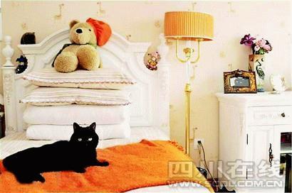 粉紅壁紙、成套白色歐式單人床、床頭柜、落地?zé)簟差^一張大頭照中的黑色貓咪,是這間屋的主人。貓主人專門(mén)將一間閑置的客臥打掃出來(lái),用作“女兒”的“閨房”。被子枕頭用不上,但是一兩條名牌的毛毯是必備的。床上的玩具是貓主人去香港迪斯尼玩時(shí)帶回來(lái)的駝色小烏龜。