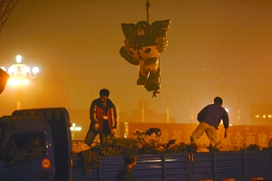 昨晚8時,大批工人進入天安門廣場,開始撤換花壇。