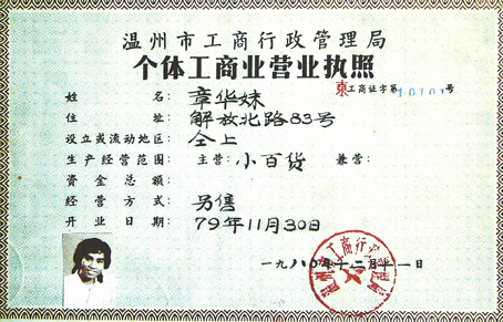 1980年12月11日,章華妹———一個19歲的溫州姑娘,從溫州市工商局鼓樓工商所領到了一張用毛筆填寫的還附有她本人相片的“個體工商戶營業執照”。讓章華妹沒有想到的是,她領到的這張編號為10101的證書,是中國第一張“個體工商戶營業執照”。