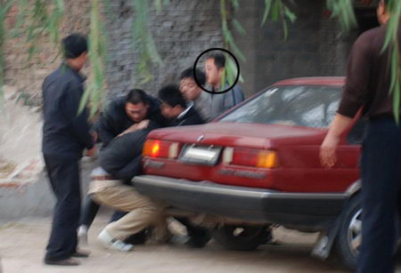 為進一步證實搓麻者的身份,記者在鎮政府附近求證時,遭遇不明身份人員搶奪攝影器材。為保護好攝影器材,三名記者遭圍攻。本報司機用車內另一臺相機拍下搶奪現場,不明身份者又來搶奪他的相機,并將其右胸刺傷。