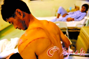 肖貴保是受傷的8人當中傷勢最重的一個,其主治醫(yī)生介紹,他面部正中一刀,刀痕從右眼正中間一直延伸到上嘴唇,后腰也被砍了一道長12厘米左右的傷口。