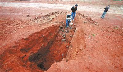 從山坡上可以看到出土漢代耳珰的平臺已經(jīng)被挖空了一大塊。據(jù)唐濤介紹:“6月初他們剛剛開工不久,我們(郴州市文物管理處)6月4日就在這塊被挖空的平臺發(fā)現(xiàn)了一座漢代磚室墓,當(dāng)時下達(dá)了‘停工通知書’,告知建設(shè)方,需經(jīng)我們對墓葬發(fā)掘后才能再動工。”但是一紙文書如石沉大海,郴州市文物管理處沒有接到建設(shè)方的任何回復(fù)。
