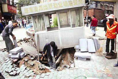 附近一酒店廚師辛輝告訴記者,上午8時40分左右,崗亭靠近馬路一側出現約兩平方米的坍塌,接著中部出現空洞,幾分鐘之后,后半部又出現塌陷。由于地陷并非瞬間完成,所以沒有路人受傷。