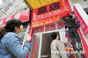 “取這樣的名字就是為了吸引眼球,其他沒啥特別的意義。”餐館老板楊宗寶稱。今年25歲的楊宗寶是合川區(qū)人,以前打工為生,最近才和好友合伙開此湯鍋店。“為了取個特別的名字,我們想了四五天。”楊宗寶稱,他經(jīng)常玩網(wǎng)絡(luò)游戲“魔獸爭霸”,游戲里把特別厲害的戰(zhàn)隊稱為“黑店”,左思右想后,他決定把“黑店”復(fù)制到自己的餐館身上。“這不,餐館明天才開業(yè),不過招牌掛出來就吸引了不少人氣。”他得意地說,沒聽有人說啥不好的。