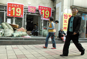 據(jù)附近一大廈保安稱,這個(gè)小店開(kāi)業(yè)不到一個(gè)星期,天天掛著這樣的橫幅,門(mén)口的音響也重復(fù)放著“老板娘跑了,小老板哭了”的促銷(xiāo)廣告語(yǔ),每天進(jìn)出的顧客很多。