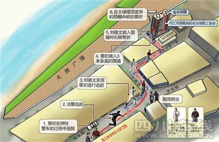 內(nèi)江市中區(qū)人民法院位于鬧市區(qū)的民族路中段,商鋪林立且緊鄰沱江邊的大洲廣場。“那天下午大約4時40分,我正好沒生意,看見2名法警將4個人從法院押出來,準(zhǔn)備押上停在路邊的警車。”長年在法院大門斜對面擺煙攤的張氏夫婦,是那天眾多目擊群眾中看得最清楚的人。“4個人是在2名法警押送下排隊走出法院大門口的,走在最前面那個小個子沒有戴手銬。剛出法院大門,他趁法警不備將衣服一脫,以飛快的速度沿著街邊人行道直往中醫(yī)院方向飛奔而去。見庭審罪犯脫逃,一名身穿制服的法警,一邊大呼‘站住,不準(zhǔn)跑’,一邊朝那名小伙子緊追而去。”