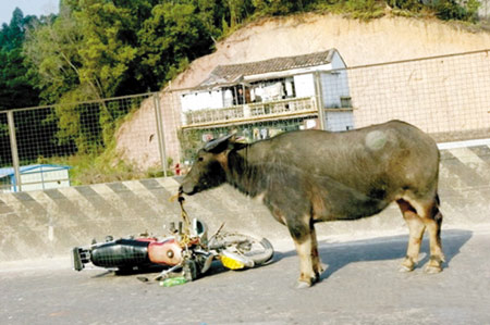 前天上午,惠州市區(qū)一頭水牛受驚嚇頂翻摩托,連接撞翻兩人,然后霸占路面,無人敢接近,導(dǎo)致交通堵塞。惠州民警擔心水牛傷人,連續(xù)開十槍才將這頭猛牛擊斃。