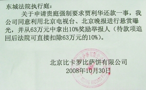 去年9月,賈利華被判返還北京比卡羅比薩餅有限公司借款63萬元。案件執行時,法院經合法傳喚,賈利華本人拒不到庭,只委托朋友來院了解案件。目前賈利華下落不明,法院依法對賈利華實施邊控限制其出境。北京比卡羅比薩餅有限公司現書面申請懸賞曝光,懸賞金為63萬元的10%。