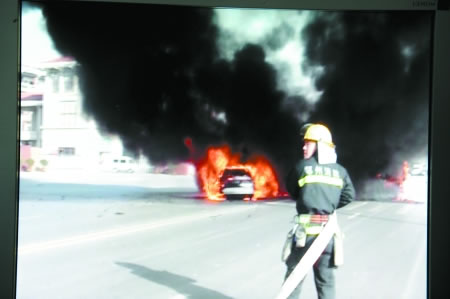 由于擔(dān)心車內(nèi)還有人被困,侯隊(duì)長(zhǎng)立刻派3名隊(duì)員和一輛高噴車從不同角度滅火。5分鐘后火勢(shì)基本上被控制,消防隊(duì)員查看后發(fā)現(xiàn)車內(nèi)并無被困人員!靶目偹惴呕囟亲永锶チ!焙铌(duì)長(zhǎng)說,七八分鐘后大火就被全部撲滅。