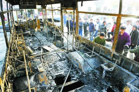 下午3時(shí)許,出事的白色奇瑞已被拖離現(xiàn)場(chǎng),被燒壞的公交車趴在地上,外胎已被燒化粘在地上,車內(nèi)的坐椅、玻璃也在大火中全部燒化,整個(gè)車體只剩下一個(gè)框架。“乖乖,鋼板都燒化了。”一名圍觀者舉著兒子使勁往前湊。
