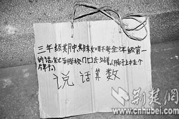 在桌子上,記者看到一塊黃色紙牌,上面寫著:“三年級期中、期末如果不考全年級第一的話,就到學(xué)校門口去站著!(如圖)。